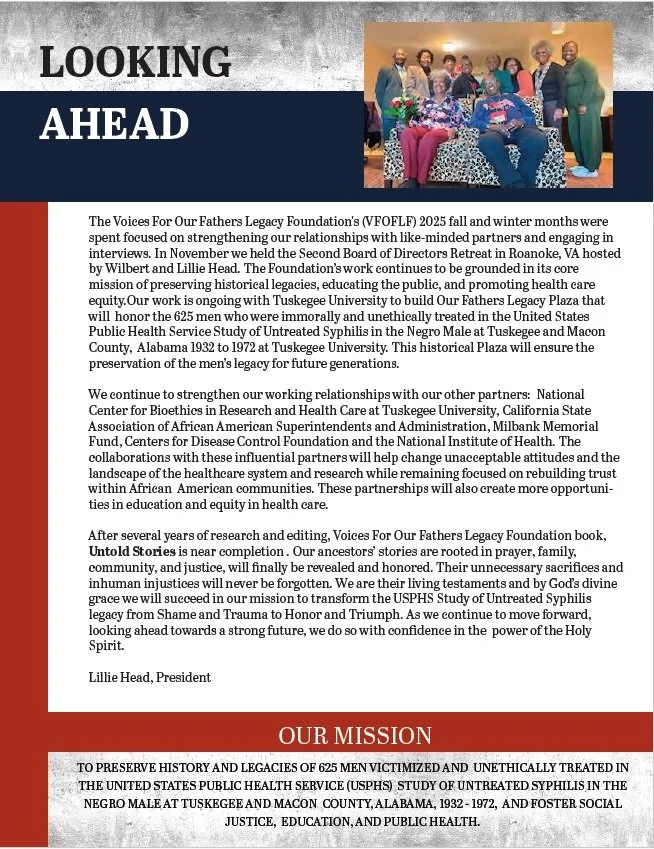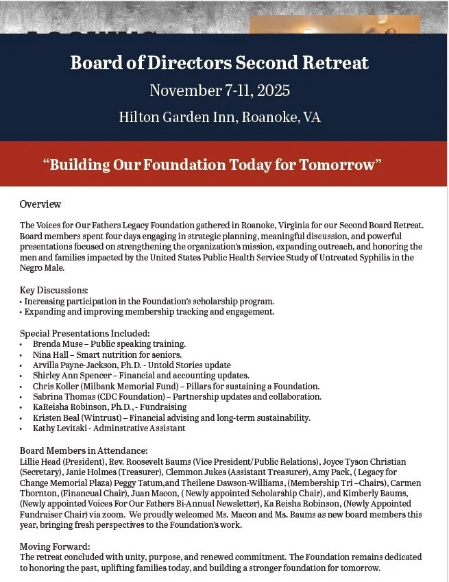The Voices For Our Fathers Legacy Foundation's (VFOFLF) 2025 fall and winter months were spent focused on strengthening our relationships with like-minded partners and engaging in interviews. In November we held the Second Board of Directors Retreat in Roanoke, VA hosted by Wilbert and Lillie Head. The Foundation’s work continues to be grounded in its core mission of preserving historical legacies, educating the public, and promoting health care equity.
