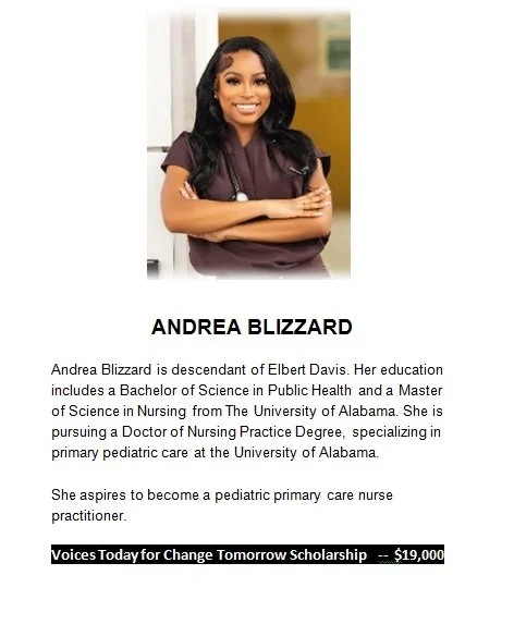 In addition, two descendants were awarded the Voices Today for Change Tomorrow scholarships, each receiving $19,000, for a combined total of $38,000. These awards were made possible with support from the CDC Foundation and its donors. Awarded for the first time this year, these competitive scholarships are available to descendants pursuing graduate studies with a demonstrated commitment to serving as medical care providers, physician scientists, clinical leaders, medical educators, public health experts and advocates for rural and urban underserved populations.