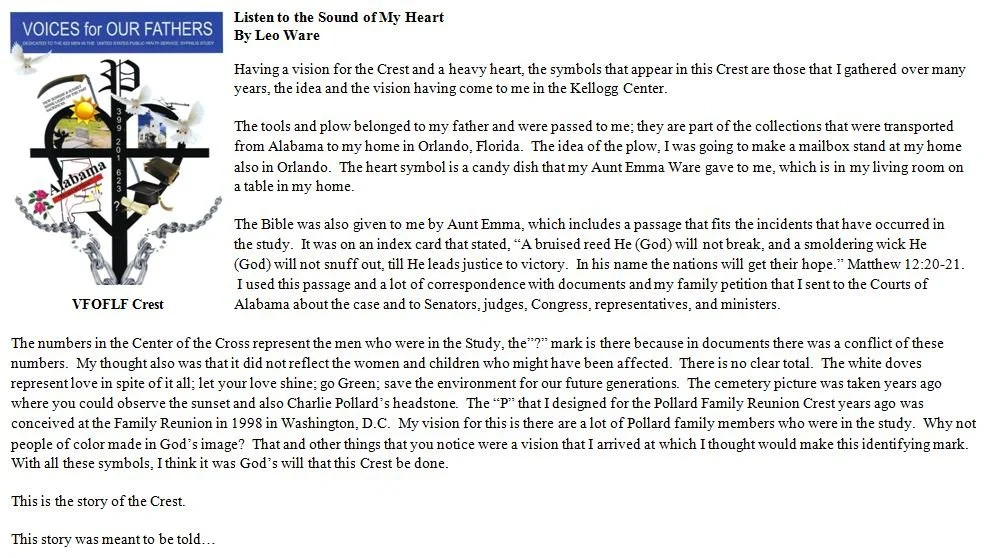 Voices For Our Fathers Legacy Foundation is dedicated to preserving history and the legacies of the 625 African American men victimized and unethically treated in the United States Public Health Service (USPHS) Study of Untreated Syphilis in the Negro Male at Tuskegee and Macon County, Alabama, from 1932 - 1972. In the annals of United States (U.S.) medical history, this study stands out as the most notorious medical research scandal for its profound impact on the ethics of medical research. It is the longest lasting non-therapeutic study in U.S. medical history.